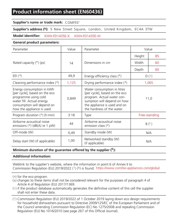 COMFEE’ Freestanding Dishwasher CDWPF1201PB-UK 60cm Width, Full Size Dishwasher