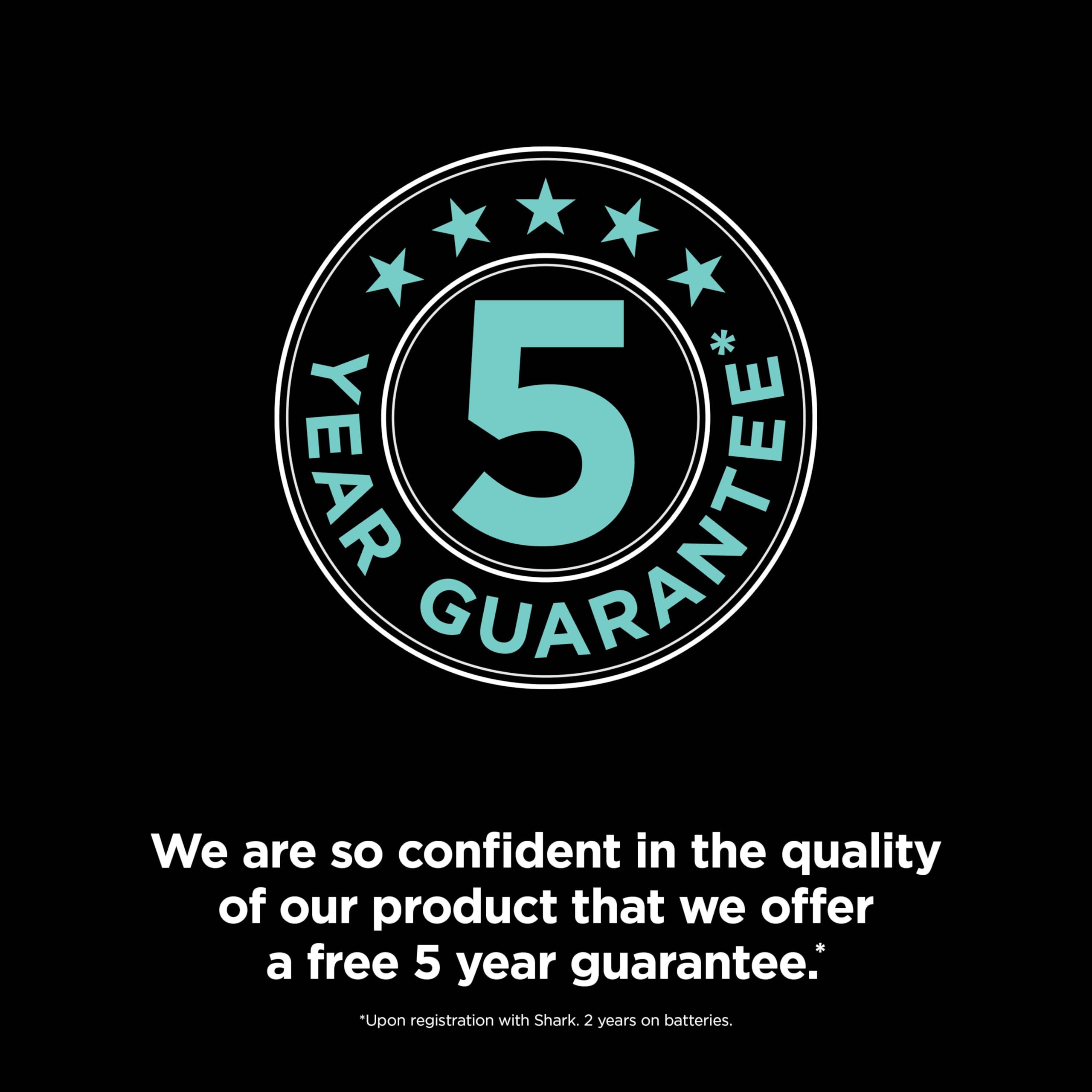 - 5-YEAR GUARANTEE: 2 years for batteries. Upon registration with Shark, UK & ROI only.